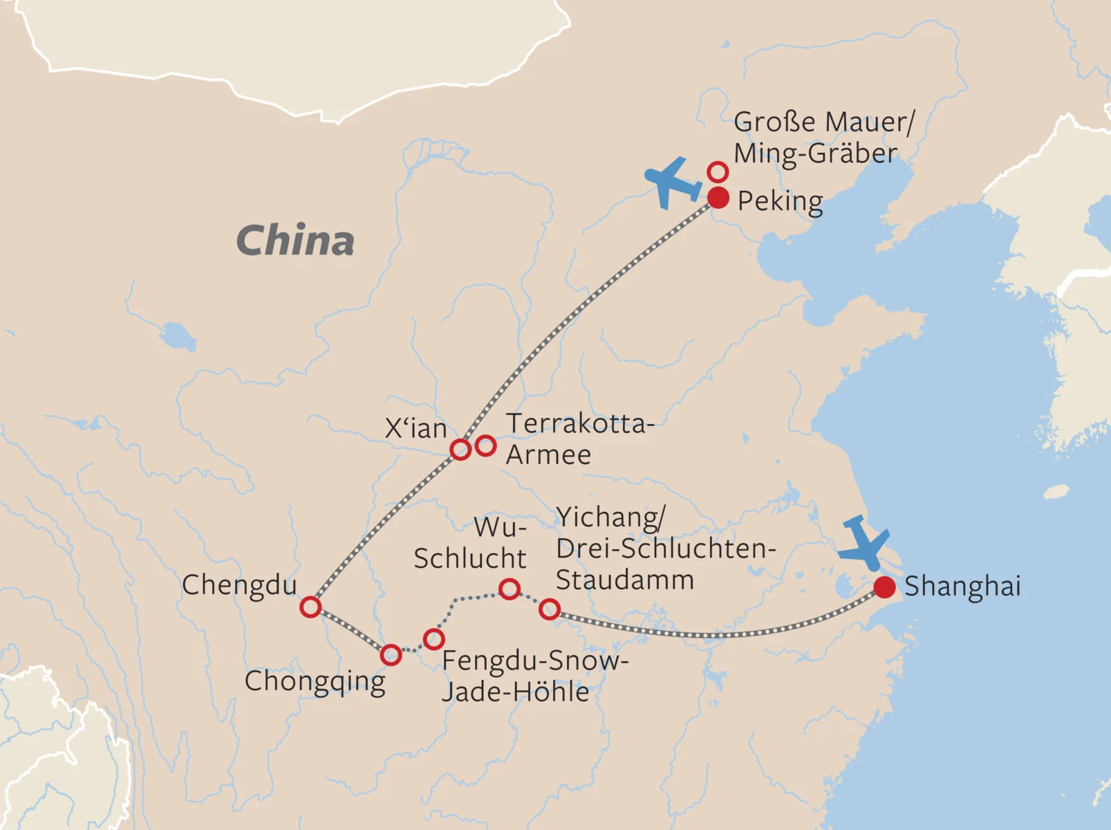 Wir fliegen nach Shanghai und tauchen in einen Schmelztiegel aus Tradition und Moderne. Dann geht es dann per Hochgeschwindigkeitszug nach Yichang. Bustransfer zur Anlegestelle Maoping. Hier erwartet uns unser luxuriöses Kreuzfahrtschiff. Ausflug zum Drei-Schluchten-Staudamm und kurz darauf heißt es auch schon: „Leinen los!“ Vier Nächte verbringen wir auf dem Flussschiff und genießen die vielfältigen Flusslandschaften. Unsere täglichen Landausflüge sind schon im Programm enthalten. Natürlich durchfahren wir auch die berühmten drei Schluchten Qutang, Wu und Xiling, die keineswegs in den Fluten des Staudamms untergegangen sind.