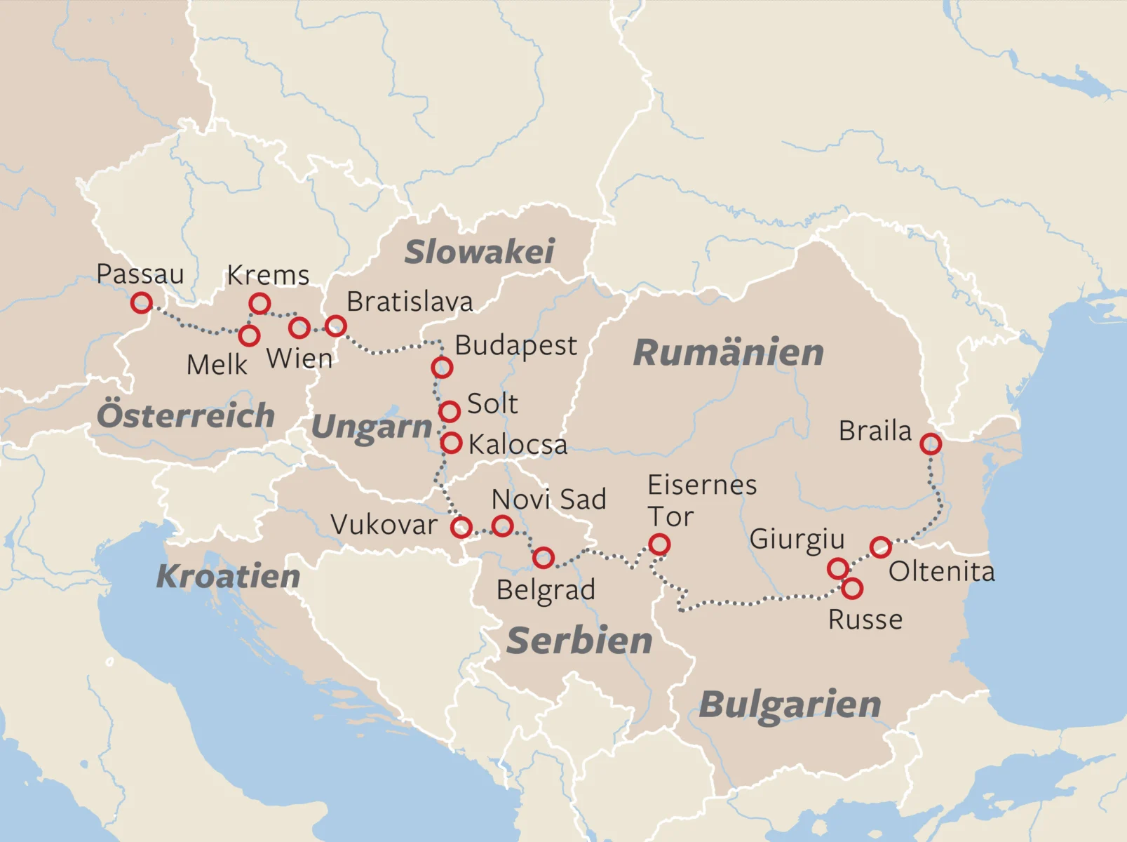 Mit MS ROUSSE PRESTIGE unternehmen wir die lange Route bis zum Donaudelta: Stolze 2.227 km von Passau bis fast zum Schwarzen Meer, durch Österreich, die Slowakei, Ungarn, Kroatien, Serbien, Bulgarien und Rumänien: somit erleben wir die uralte Wasserstraße fast auf ihrer vollen Länge.