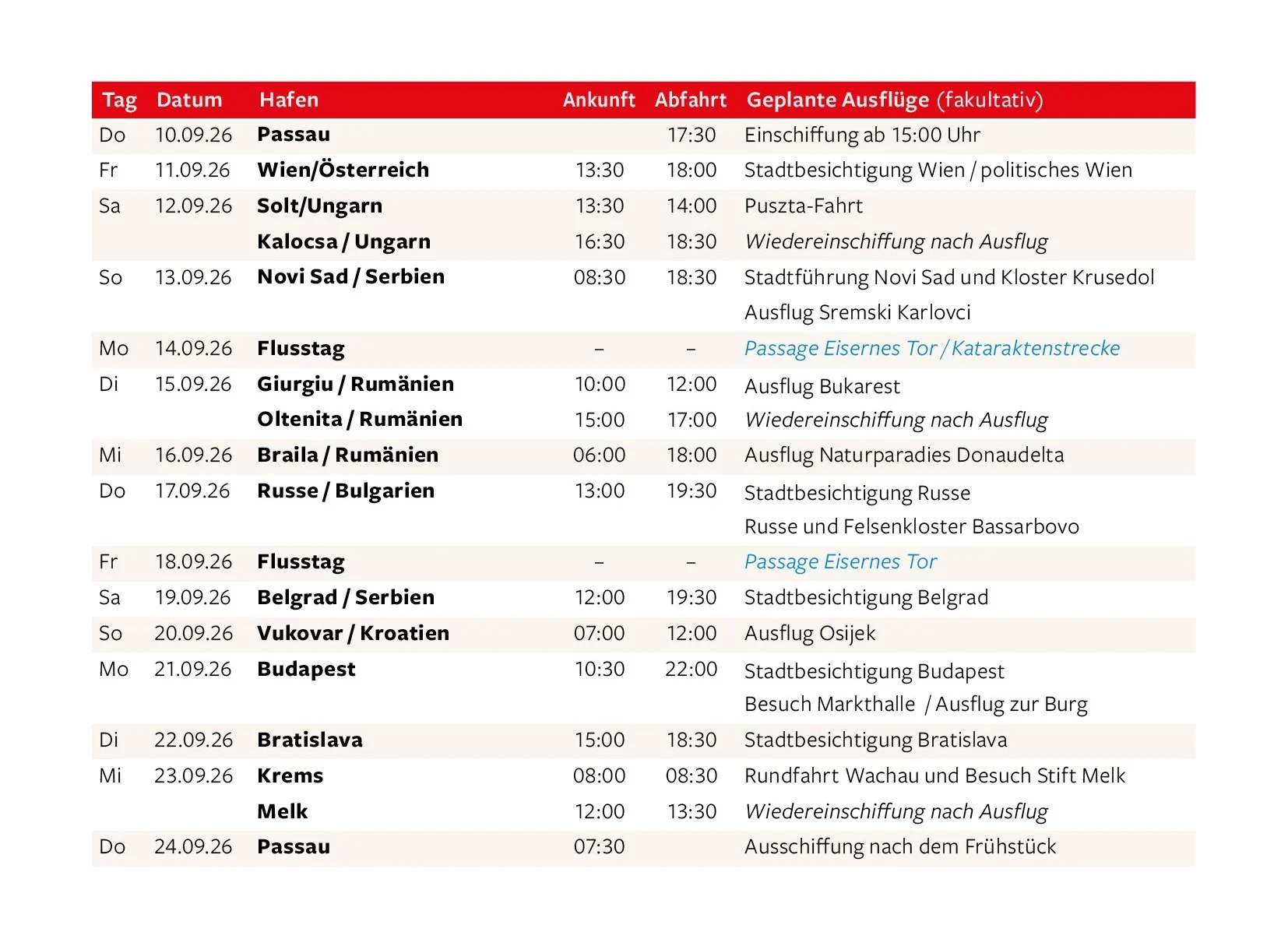 Auf dieser Reise durch eine der schönsten Flusslandschaften Europas besuchen wir die herausragenden Kulturdenkmäler der k. und k.-Hauptstädte Wien, Bratislava und Budapest sowie die malerische Wachau, das Donauknie, die ungarische Puszta und die Walachei. Neben der spektakulären Passage des Eisernen Tores erwarten uns die Hauptstädte Belgrad und Bukarest, beeindruckende Felsenklöster in Bulgarien sowie das Mündungsdelta der Donau, ein Paradies für Flora und Fauna. Zwischen den einzelnen Reisestationen bleibt ausreichend Zeit für Entspannung und Muße, für informative Vorträge und anregende Gespräche im Kreise Gleichgesinnter.