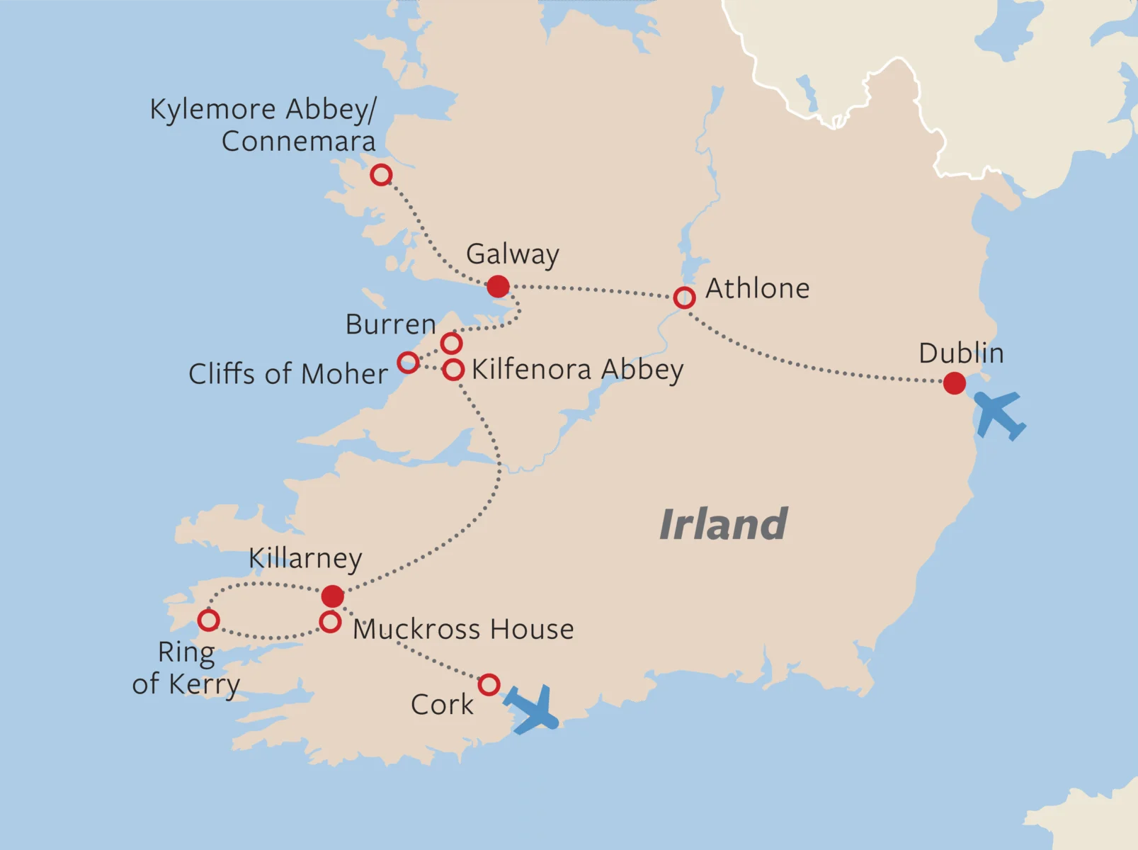 Die Wiesen erstrahlen in saftigem Grün, Wildblumen machen mit buntesten Farben auf sich aufmerksam, Schafe und Lämmer genießen den warmen Hauch des vorbeiziehenden Golfstroms. Herrlich anzuschauende Küstenpanoramen, eigentümliche Landschaften mit geheimnisvollen Abteien und lebhaften Städten. Und zu Beginn: Ein ganzer Tag in der sympathischen Hauptstadt Dublin!