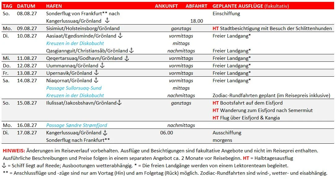 Seit vielen Jahren bieten wir nun schon Kreuzfahrten nach Grönland an und die Nachfrage ist weiterhin so stark, dass die von uns im Katalog 2026 veröffentlichte Kreuzfahrt mit MS HAMBURG am 27.08.2026 bereits jetzt ausgebucht ist!