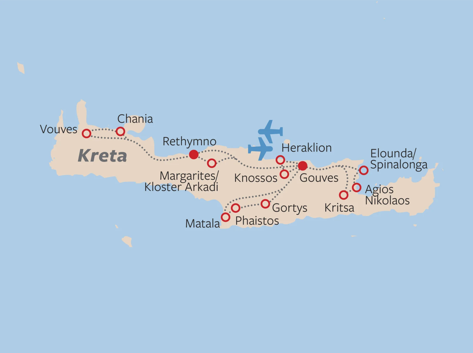 Keine Insel des gesamten Mittelmeers kann alljährlich mehr Sonnentage versprechen. Zudem locken zahllose Strände, mal endlos weit, mal in kleinen versteckten Buchten, Fischerdörfer und reizende Hafenstädtchen, dem Meer zugewandt, und im Inselinneren fruchtbare Ebenen zwischen hoch aufragenden Gebirgen. Hierher entführte Göttervater Zeus die schöne phönizische Prinzessin Europa. Freunde der griechischen Sagenwelt müssen Kreta einmal in ihrem Leben gesehen haben.