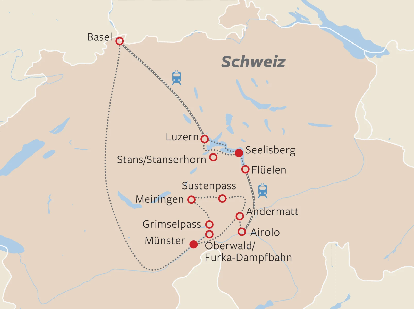 Am Vierwaldstättersee, eingebettet in eine spektakuläre Bergkulisse genießen wir entspannte Schiffsfahrten und spektakuläre Bergbahnen oder erkunden charmante Orte. Ein ganz besonderes Highlight für Eisenbahnfreunde ist die Furka-Dampfbahn – eine historische Zahnradbahn, die sich durch alpine Landschaften windet und spektakuläre Ausblicke auf Gletscher und Täler bietet. Ob am Wasser, auf Schienen oder im Postauto – die Schweiz begeistert mit unvergesslichen Reiseerlebnissen.