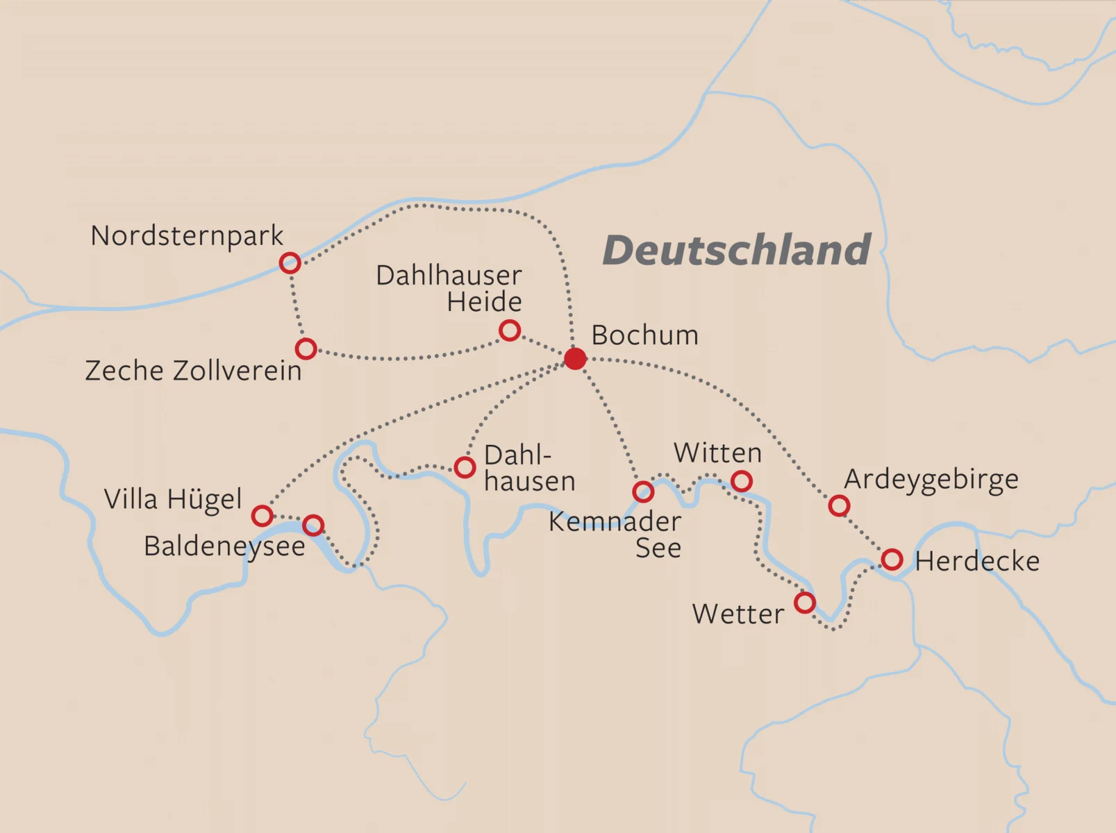 Wie einst Westernhagen oder auch Grönemeyer ihrer Heimat Tribut zollten, so sind auch die Pottbewohner stolz auf ihre 2010 zur Kulturhauptstadt Europas gekrönte Heimat. Das Ruhrgebiet steht für stillgelegte Kohleminen, Pommes Schranke oder den Pott´schen Dialekt der gelassenen Bürger. In den letzten 100 Jahren hat sich das Ruhrgebiet von der Industriezone zu einer kulturellen Perle gewandelt, das jährlich zahlreiche Besucher in seinen Bann zieht. Lernen also auch wir diese Perle einmal aus einer anderen Perspektive kennen – nämlich vom Fahrrad aus.