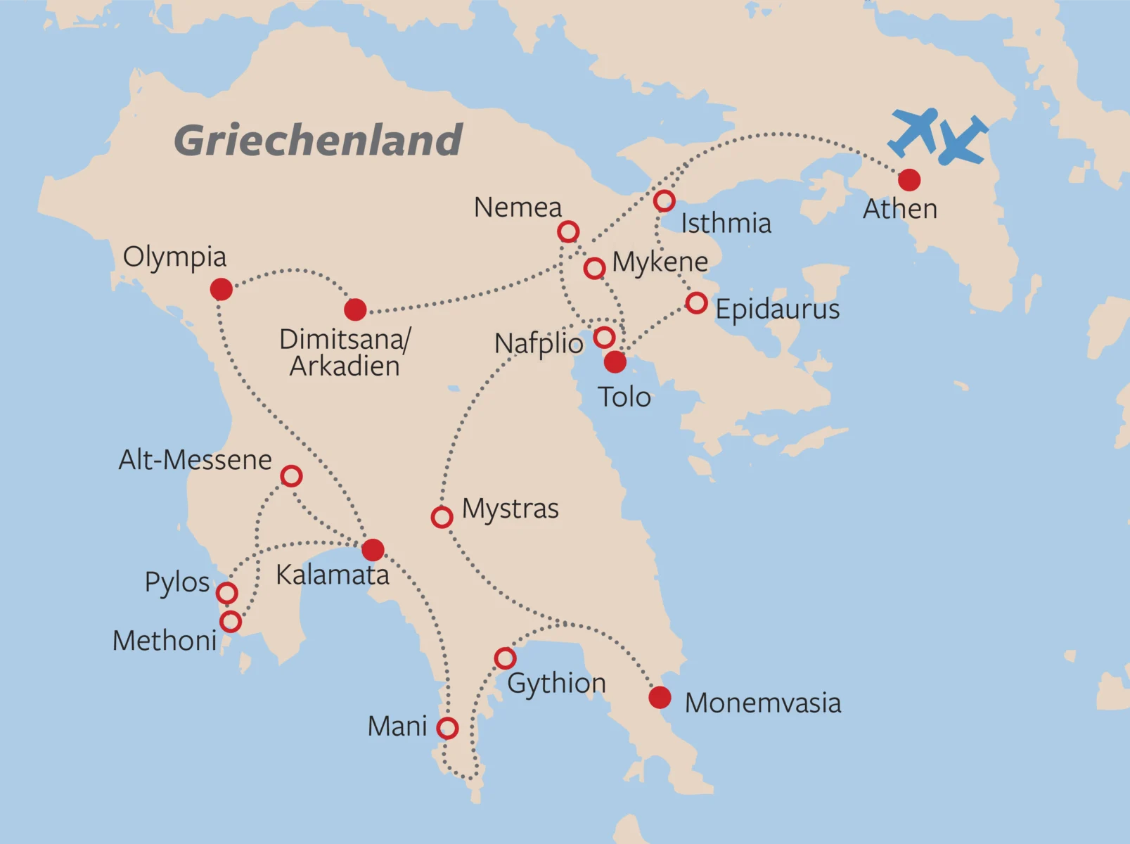 Der Peloponnes – ein Landstrich, in dem die Zeit in antiken Ruinen stillzustehen scheint und das Meer in allen Blautönen schimmert. Zwischen Olivenhainen und steilen Küsten begegnen wir einer einzigartigen Mischung aus Geschichte, Kultur und Natur. Eine Reise ins Herz Griechenlands, wo Mythen lebendig werden und die Vergangenheit bis heute spürbar bleibt.