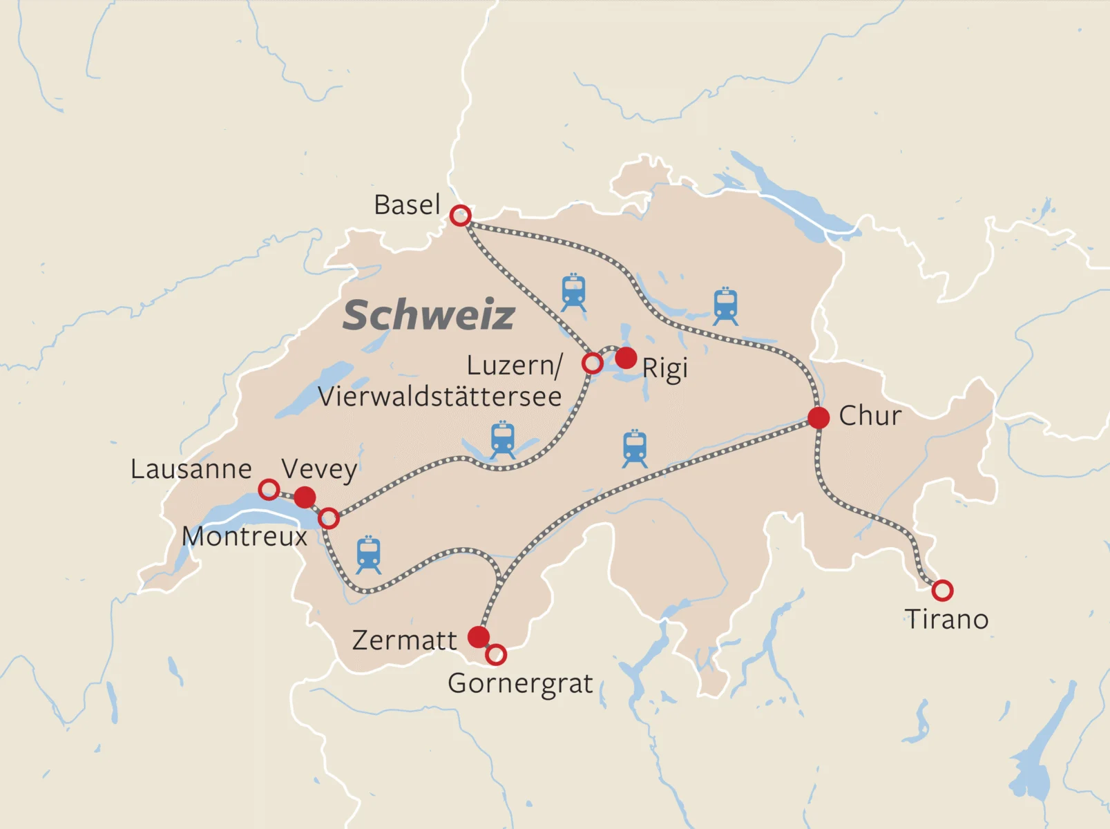 Von Chur fahren wir über St. Moritz mit dem Bernina-Express hinauf ins Engadin, bis hinunter ins italienische Tirano und wieder zurück, passieren dabei einzigartige Bahn-Bauwerke und genießen faszinierende Ausblicke. Die Fahrt mit dem Glacier-Express, dem “langsamsten Schnellzug der Welt“, nach Zermatt ist die wohl eindrucksvollste Bahnreise der Alpen. Weiter geht es ganz in die Westschweiz ins mondäne Montreux am herrlichen Genfer See. Die Fahrt auf der Golden Pass Line bringt uns die Zentralschweiz. Von Arth-Goldau geht es mit der Zahnradbahn auf die Rigi. Eine Übernachtung in Rigi-Kaltbad hoch über dem Vierwaldstättersee ist der krönende Abschluss der Reise bevor es via Luzern zurück nach Basel geht.