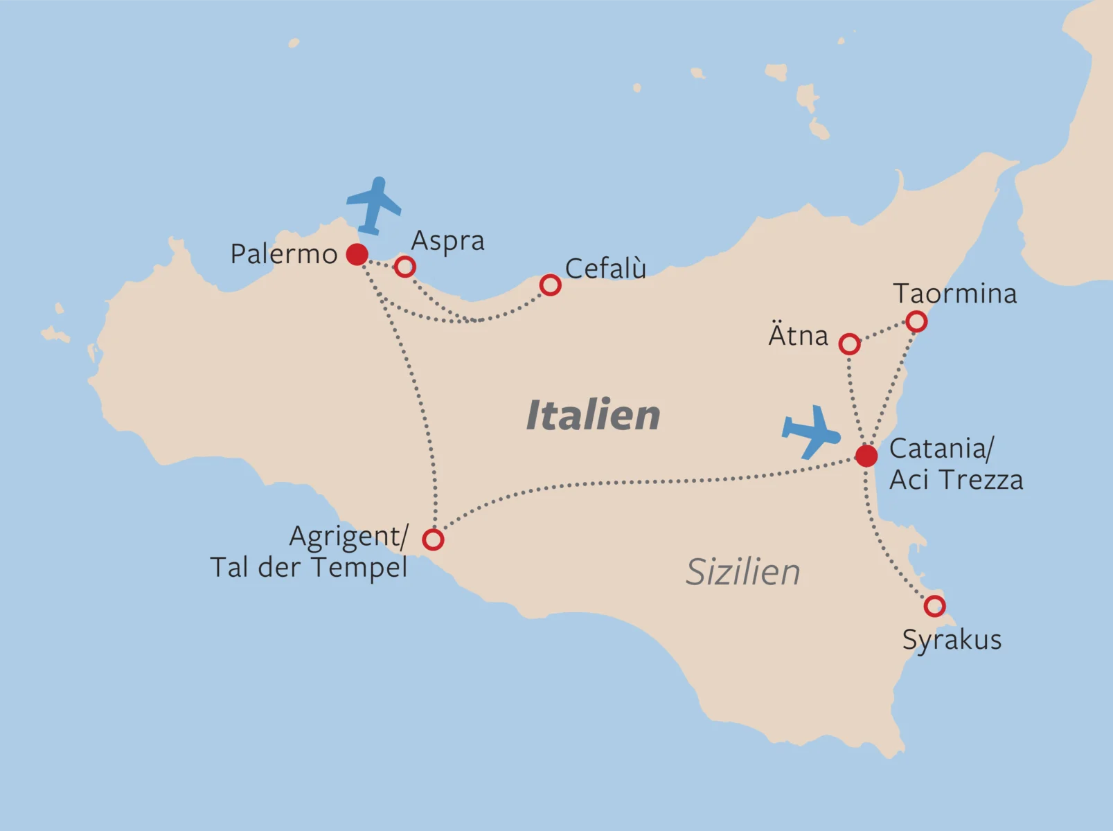 Griechische Tempel, arabisch-normannische Paläste und barocke Altstädte erzählen von einer Insel, die seit Jahrtausenden im Zentrum mediterraner Kulturen steht; ein Freilichtmuseum, das seine Besucher mit unermesslichen Kulturschätzen und traumhaften Landschaften verwöhnt. Egal, ob man den höchsten aktiven Vulkan Europas bestaunt, die herrlichen Strände genießt oder architektonische Juwelen entdeckt, Sizilien ist eine fast unerschöpfliche Quelle von Genüssen.