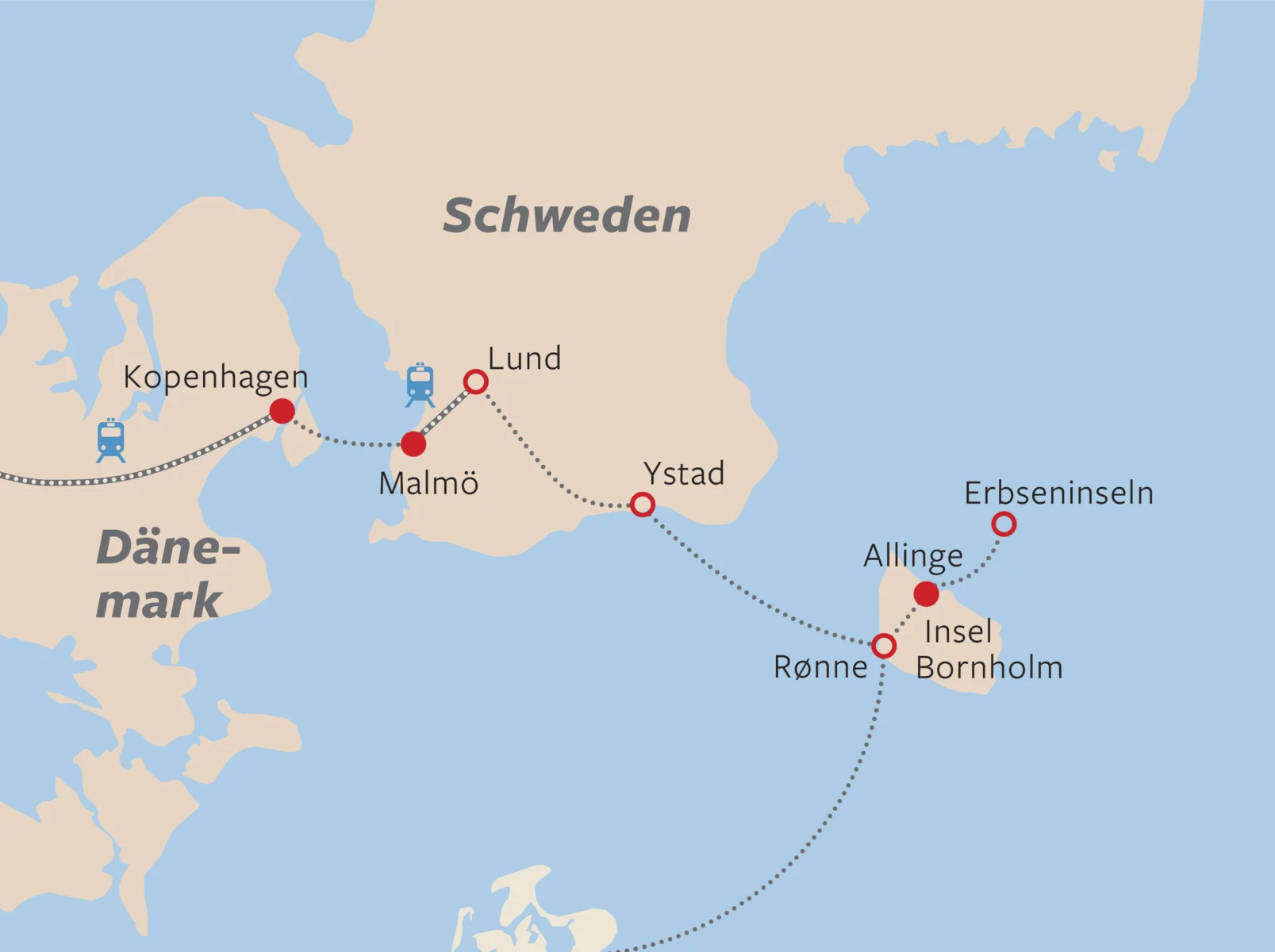 Entdeckt mit uns die Vielfalt Skandinaviens! Wir starten in Kopenhagen, Dänemarks gemütlicher Hauptstadt. Nur eine Brücke entfernt liegt das schwedische Malmö mit seiner Mischung aus moderner Architektur, pittoresken Plätzen und Erholung im Grünen. Wir besuchen die alte Universitätsstadt Lund und Ystad, Heimat der Romanfigur Kurt Wallander, bevor es auf die dänische Sonneninsel Bornholm geht, wo uns dramatische Klippen, weiße Sandstrände, charmante Fischerdörfer und geschichtsträchtige Inseln erwarten.