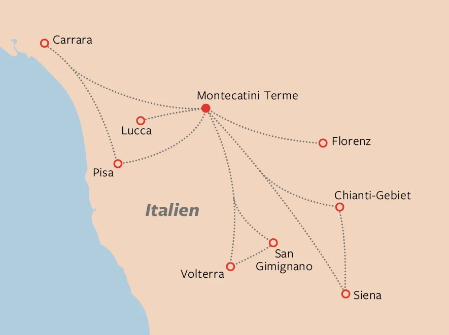 Nach Ankunft in Pisa erfolgen der Transfer nach Montecatini Terme zum Hotel Ariston und das Abendessen