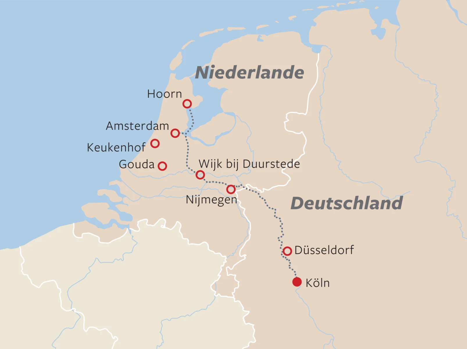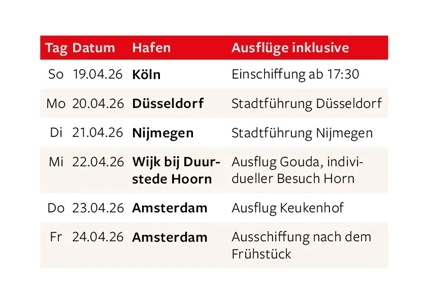 Lasst euch auf dieser stilvollen Flussreise von den Schönheiten des Rheins verzaubern. Genießt historische Städte, sanfte Flusslandschaften und ein abwechslungsreiches Ausflugsprogramm. Die geschichtsträchtige Universitätsstadt Nijmegen, das malerische Gouda und das charmante Städtchen Hoorn am Ijsselmeer erwarten uns. Den krönenden Abschluss bildet Amsterdam mit einem Besuch im farbenprächtigen Blumenparadies Keukenhof.
